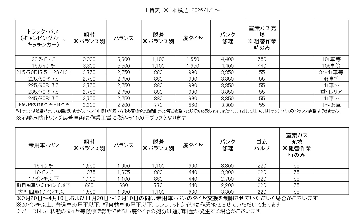 車高の低い車両、リフトアップ車両、エアロパーツ装着車両、改造車両、超扁平タイヤ(普通車35扁平以下、軽自動車45扁平以下)、特殊タイヤサイズ、損傷のあるタイヤ、損傷のあるホイール、製造年の古いタイヤ(製造より10年超経過後のタイヤ)、一部輸入タイヤ、特殊ホイール、ホイールリム部に段差があるホイール、空気圧センサー付きホイール、ランフラットタイヤ、スペーサー装着車、一部輸入車、特殊ナット、特殊エアバルブ、塗装直後のホイール、腐食が進んだホイール、錆等で固着して外すことができないホイールもしくはスペアタイヤ、荷積み状態のトラック等当店で対応不可の車両につきましてはお断りする場合がございますので予めご了承ください。トラックのナットキャップ等の装飾品はあらかじめ外した状態でご来店頂きますようご協力お願いいたします。当店では大型トラック(車両総重量8トン以上)は590N.mでトルクレンチを使用してホイールナットの締め付け確認を行っております。それ以外の希望トルクがございましたらお申し出ください。タイヤ保管サービス、ネットショップから店舗への直送サービスは行っておりません。11月、12月、3月、4月は大型トラック(19.5~22.5インチ)の窒素ガス充填はできません。窒素ガスは空気圧が低下しにくい特性がありますが空気圧が全く低下しないわけではありません。定期的な空気圧点検は必ず実施していただきますようよろしくお願いいたします。なお、窒素ガスに通常の空気を混ぜても(窒素ガスの効果は少なくなりますが)安全上は全く問題ありません。1日で予約可能な台数はお一人様(一法人様)大型車両2台まで、4トン以下3台までとなります。タイヤをお持ち込みされる場合は持ち込まれたタイヤの品質や性能上の問題等タイヤ交換後のトラブルに関しましては当社の施工が原因の不具合を除き一切の保証を致しません。タイヤをご購入された店舗へご相談ください