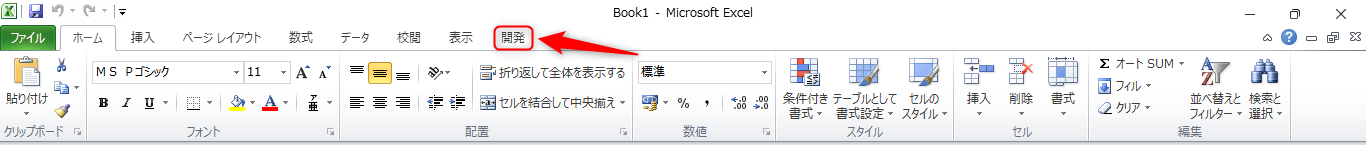これで画面上部に開発のタブが現れるはずです。この開発をクリック