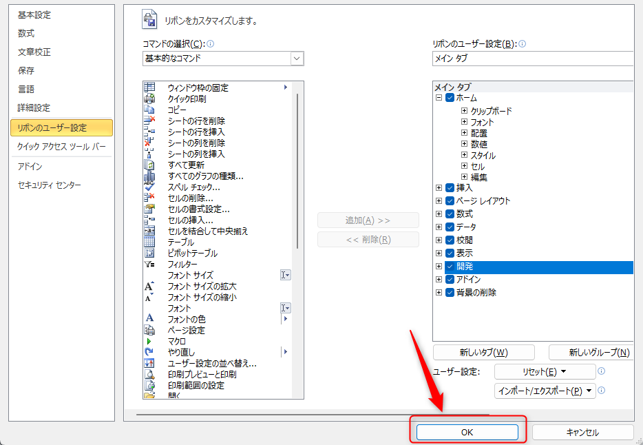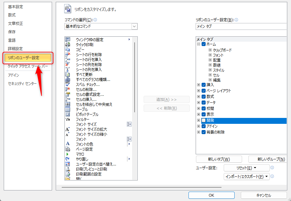 リボンのユーザー設定をクリック