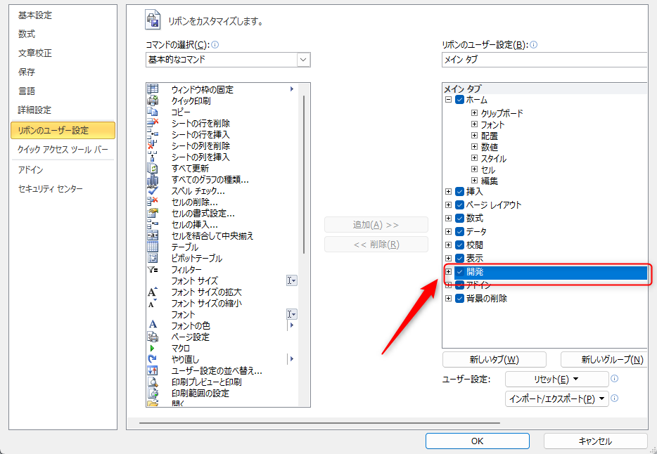開発をクリック(レ点をいれる)
