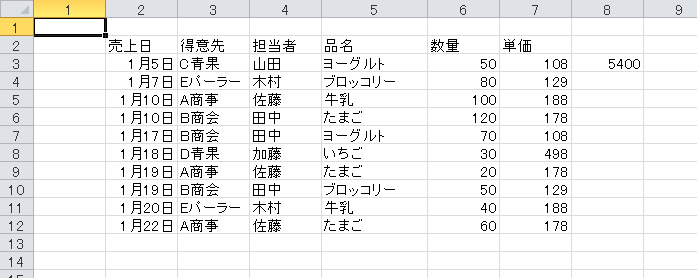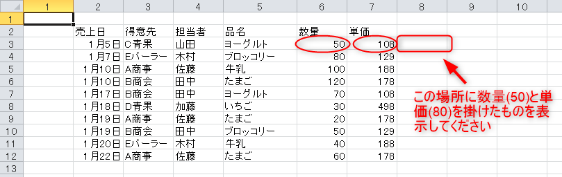 行番号3、列番号8に数量に単価を掛けた金額を表示してみましょう